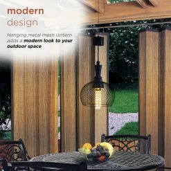 Add contemporary style to your outdoor area with the 10″ tall Hanging Solar Powered Outdoor Mesh Lantern with LED Lights from Alpine Corporation. This lighted outdoor dΓ©cor piece features 24 warm white LED lights with a unique, patented filament. It is powered by solar energy to offer your guests a warm welcome and charges during the day to keep your lantern lit for up to 8 hours on a full charge. This stylish lantern suits both modern and traditional dΓ©cor, and its distinctive mesh cage overlay diffuses light for a soft ambiance. With a durable metal exterior, the yard art is made tough for outdoor use and is weather-resistant for long-lasting, quality use in your front yard or backyard or along your sidewalk. Add one or multiple lanterns to create an enchanted garden display. The outdoor lamp is perfect for display on pathways, entryways, courtyards, and outdoor living spaces. For a hassle-free set-up, the 10″ tall Hanging Solar Powered Lantern comes with everything needed to install it, including a chain and mounting hook. The decorative garden decor measures 7″L x 7″W x 10″H (26″ hanging with chain) to fit almost any outdoor space, and includes a one-year manufacturer’s warranty from date of purchase.Alpine Corporation is one of America’s leading designers, importers, and distributors of superior quality home and garden decor products. Alpine’s award winning in-house design team continuously develops new and innovative “statement pieces” for your home and garden. Your outdoor living spaces will be the envy of the neighborhood with our wide assortment of fresh, fashionable and contemporary products, from beautifully crafted solar garden stakes featuring patented motion and fiber optic lighting technology to gorgeous glass and glow-in-the-dark birdbaths and feeders.