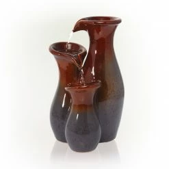 Bring tranquility to your space with the Alpine Corporation 11″H Tiered Glossy Ceramic Vase Tabletop Fountain. This decorative fountain features a cascading ceramic vase design in an upscale gradient brown and gray glaze finish with an interior pump that keeps the water flowing – just plug it in! This versatile zen fountain is great for adding ambiance in your home’s entryway, living room, office, bedroom, kitchen, and more. The tranquil sounds of water gently cascading down the tops of the three vases creates a calm and relaxing atmosphere while blocking out unwanted sounds. The durable ceramic construction provides long-lasting indoor use. To start using the fountain, simply plug in the 6-ft. cord, fill with water, and turn the convenient on/off switch on to start the calming water flow. This tabletop-sized fountain measures 7″L x 6″W x 11″H to fit in compact spaces, and it includes a one year manufacturer’s warranty from date of purchase.Alpine Corporation is one of America’s leading designers, importers, and distributors of superior quality home and garden decor products. Alpine’s award winning in-house design team continuously develops new and innovative “statements pieces” for your home and garden. Your outdoor living spaces will be the envy of the neighborhood with our wide assortment of fresh, fashionable and contemporary products, from beautifully crafted solar garden stakes featuring patented motion and fiber optic lighting technology to beautiful fountains and delightful bird baths and feeders.