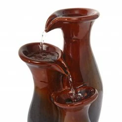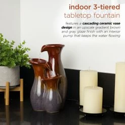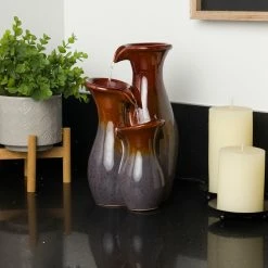 - Features a cascading ceramic vase design in an upscale gradient brown and gray glaze finish with an interior pump that keeps the water flowing – just plug it in!