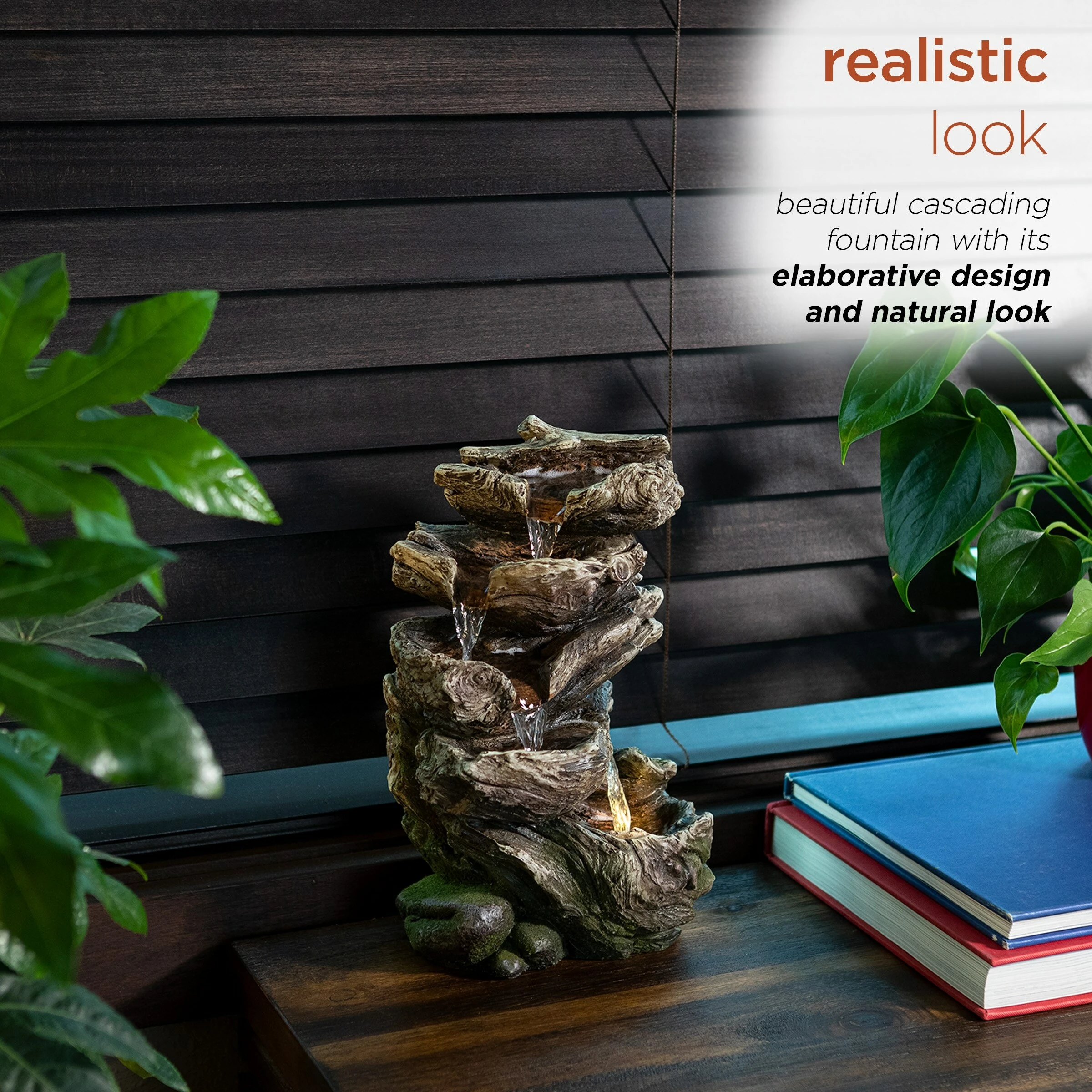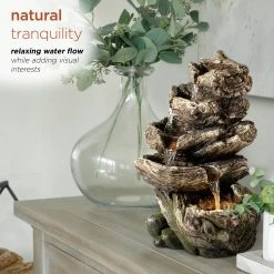 - Relax to the sounds of the calming natural water flow as it trickles down through the tiers while adding visual interest to your courtyard, garden, lawn, or home’s interior