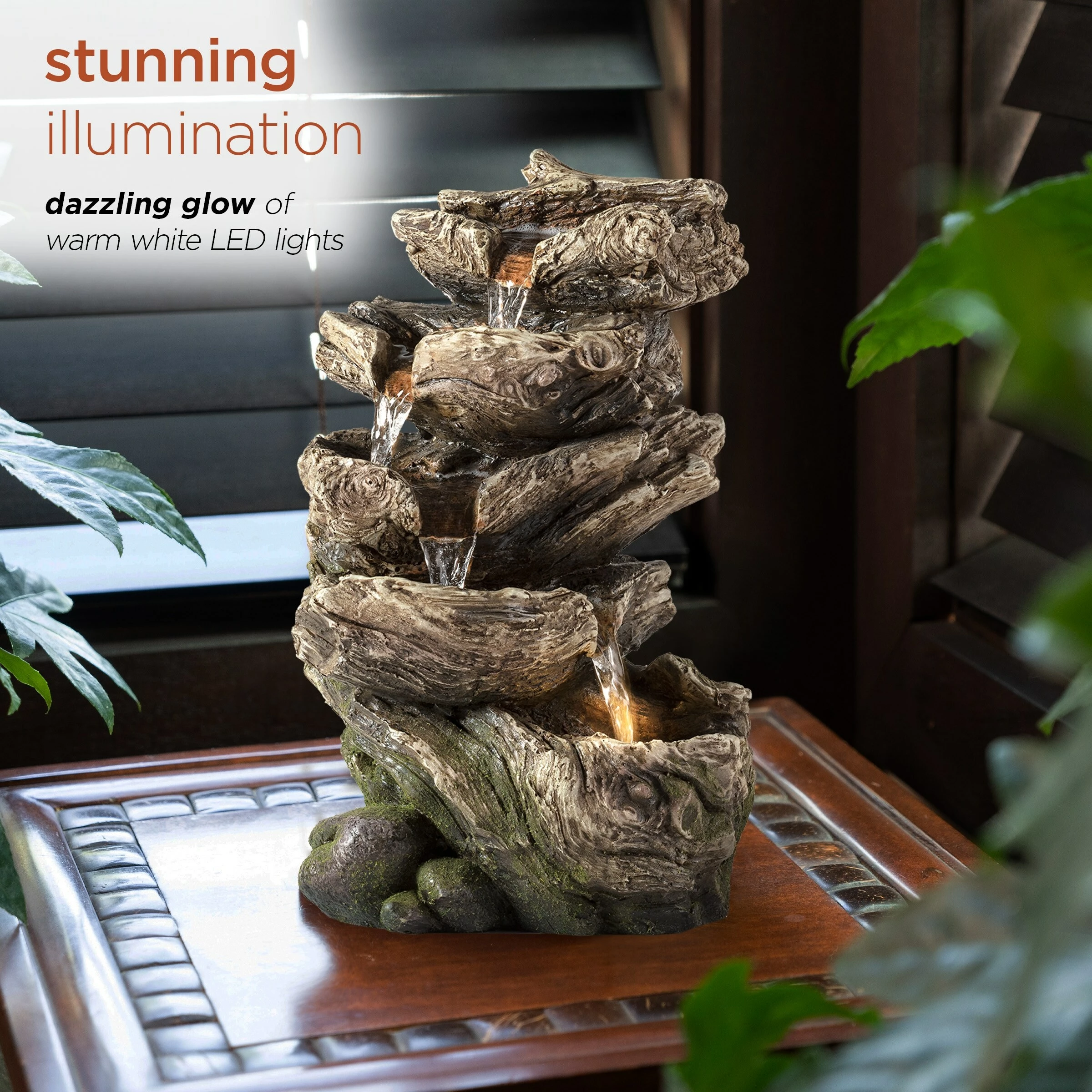 - Cascading rainforest waterfall tabletop fountain with long-lasting LED lights provides a tranquil and soothing addition to your living space, porch, or lawn