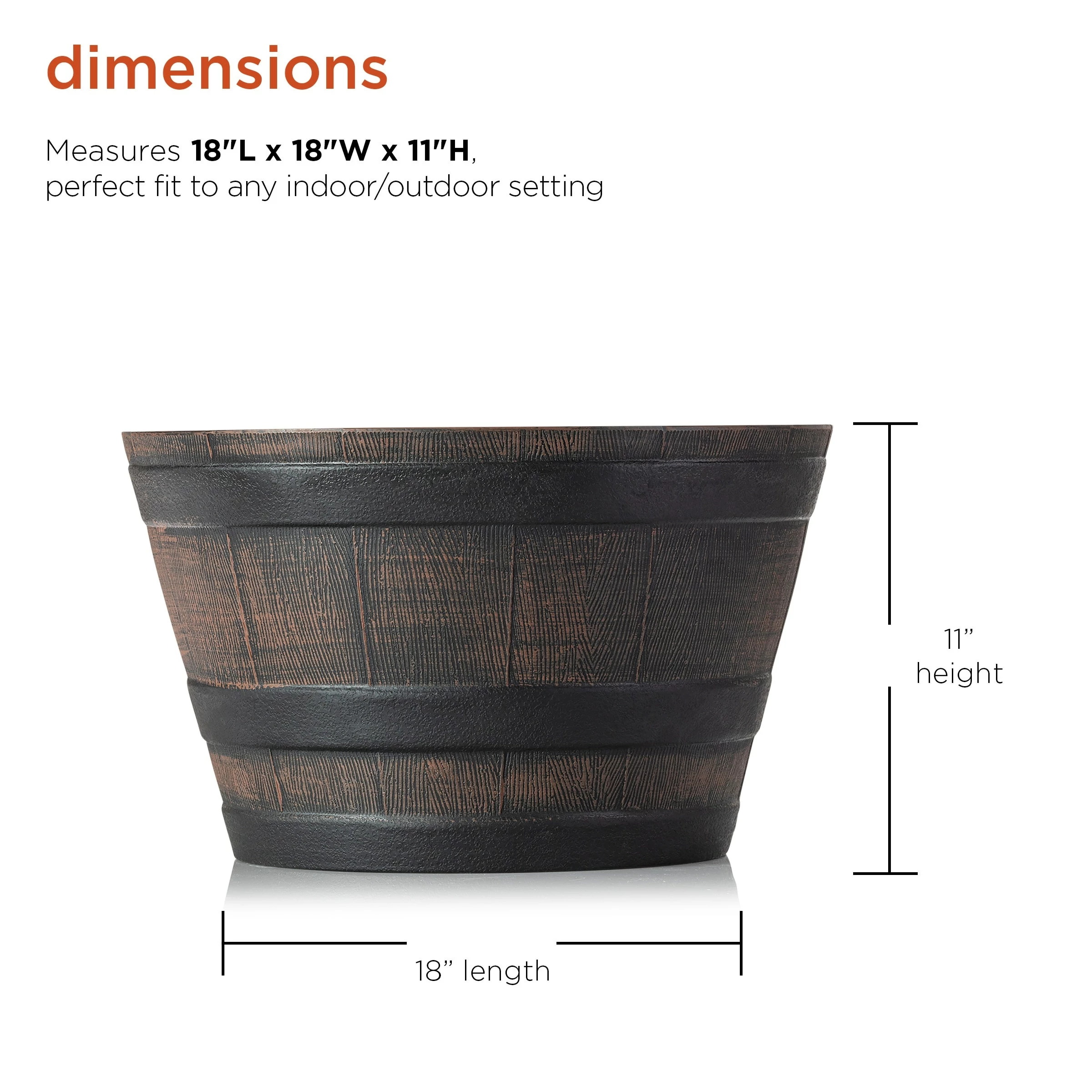 Enhance your indoor or outdoor space with the Alpine Corporation 11″ tall Indoor/Outdoor Barrel Shaped Planter. Add your favorite flowers, plants, or herbs to this decorative flowerpot. The whiskey barrel planter flowerpot features a rustic-style bronze look and a convenient drainage hole, and adds a unique and decorative addition to your home’s interior or exterior space. Constructed from resilient and weather-resistant plastic, the barrel-shaped planter is durable and will provide long-lasting quality use in your garden or on your home’s porch, patio, or deck. With the integrated drainage hole, excess water is able to drain out after watering, letting your planted flowers grow strong and healthy. The drainage hole protects plants from rot, fungus, and bacteria. Add this versatile home dรฉcor planter to any outdoor living area or any room in your home. The flowerpot can be used in a variety of ways, including in your flowerbeds, courtyard, or front yard or as an accent piece in your living room or front entryway. The decorative planter measures 18″ in diameter and 11″ high to fit almost any indoor or outdoor space, and includes a one year manufacturer’s warranty from date of purchase.Alpine Corporation is one of America’s leading designers, importers, and distributors of superior quality home and garden decor products. Alpine’s award winning in-house design team continuously develops new and innovative “statements pieces” for your home and garden. Your outdoor living spaces will be the envy of the neighborhood with our wide assortment of fresh, fashionable and contemporary products, from beautifully crafted solar garden stakes featuring patented motion and fiber optic lighting technology to gorgeous glass and glow-in-the-dark birdbaths and feeders.