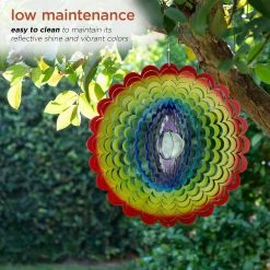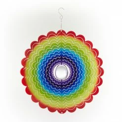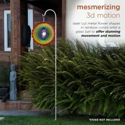 Add vibrant color and magical 3D motion to your outdoor space with the Alpine Corporation Hanging Metal Planet Wind Spinner. This captivating wind spinner is designed with rainbow-colored flowers, created with laser-cutting technology, orbiting a clear glass ball to offer stunning movement and motion. This hanging spinner can be placed on its own or paired with multiple spinners along your patio, porch, driveway, or pathway to create a mesmerizing outdoor display. The durable stainless steel construction with glass ball is designed for long-lasting and all-season outdoor use, and it is easy to clean to maintain its reflective shine and vibrant colors. This windmill spinner measures 12″L x 2″W x 12″H with a hanging height of 15″ (stake not included) to make a statement in your yard, and includes a one year manufacturer’s warranty from date of purchase.Alpine Corporation is one of America’s leading designers, importers, and distributors of superior quality home and garden decor products. Alpine’s award winning in-house design team continuously develops new and innovative “statements pieces” for your home and garden. Your outdoor living spaces will be the envy of the neighborhood with our wide assortment of fresh, fashionable and contemporary products, from beautifully crafted solar garden stakes featuring patented motion and fiber optic lighting technology to beautiful fountains and delightful bird baths and feeders.