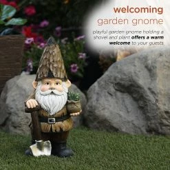 - Playful garden gnome holding a shovel and plant offers a warm welcome to your guests
