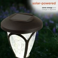 - Solar-powered LEDs require no electricity. Place in a sunny area and lights will automatically light up your landscaping for up to 8 hours.