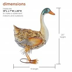 Add a bold accent to your indoor or outdoor space with the Alpine Corporation Metal Standing Duck Garden Decoration. This metal lawn figurine features a standing gold feathered duck with a green head to offer a friendly welcome to your guests. This stunning statue can be placed on its own or paired with multiple statues to create an artful display. It can also be used as a decorative accent in your flowerbeds, as a table centerpiece, or as part of your home’s interior decor. Made from durable metal, this lawn decoration is weather-resistant and rust-resistant for years of quality use. This metal bird statue measures 13″L x 7″W x 20″H to make a statement indoors and outdoors, and it includes a one year manufacturer’s warranty from date of purchase.Alpine Corporation is one of America’s leading designers, importers, and distributors of superior quality home and garden decor products. Alpine’s award winning in-house design team continuously develops new and innovative “statements pieces” for your home and garden. Your outdoor living spaces will be the envy of the neighborhood with our wide assortment of fresh, fashionable and contemporary products, from beautifully crafted solar garden stakes featuring patented motion and fiber optic lighting technology to beautiful fountains and delightful bird baths and feeders.