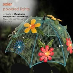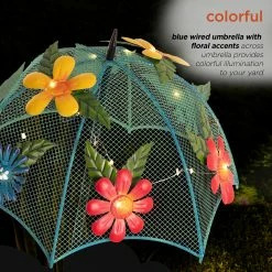 - Blue wired umbrella with floral accents across umbrella provides colorful illumination to your yard