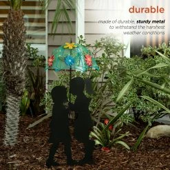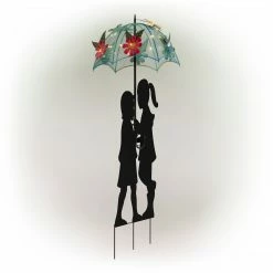 Brighten up your patio, lawn, or garden with the Alpine Solar Girl and Boy Silhouette with Solar Lighted Umbrella! This outdoor accessory adds a sense of childhood whimsy to your lawn. The silhouette cutout of a girl and boy under an umbrella is timeless and looks great against any outdoor dΓ©cor. The umbrella is adorned with plastic flowers and is brightly lit by the solar-powered LED lights to shine throughout your garden. It’s easy to use β simply place it in your garden to charge during the day and watch as it illuminates at night bringing life into your yard. This accessory is weatherproof to withstand the harshest weather conditions and last throughout the year. The Alpine Solar Girl and Boy Silhouette with Umbrella measures 15″L x 15″W x 39″H, the perfect size for your lawn. Alpine Corporation is one of America’s leading designers, importers, and distributors of superior quality home and garden dΓ©cor products. Alpine’s award winning in-house design team continuously develops new and innovative “statements pieces” for your home and garden. Your outdoor living spaces will be the envy of the neighborhood with our wide assortment of fresh, fashionable and contemporary products, from beautifully crafted solar garden stakes featuring patented motion and fiber optic lighting technology to gorgeous glass and glow-in-the-dark birdbaths and feeders.