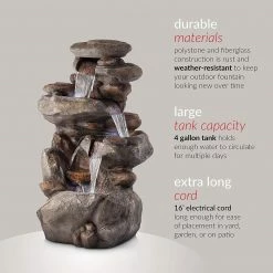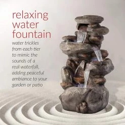 - Water trickles from each tier to mimic the sounds of a real waterfall, adding peaceful ambiance to your outdoor setting