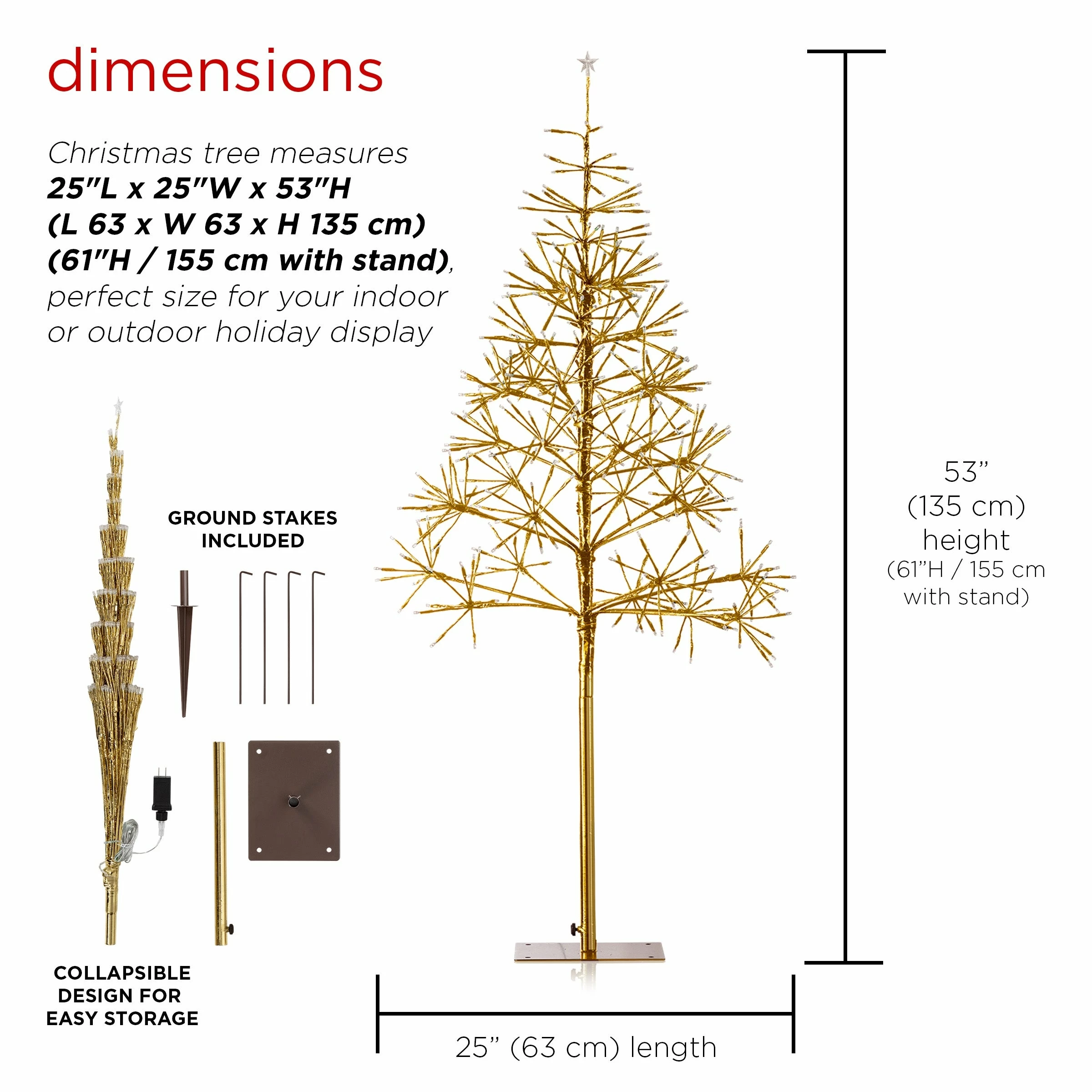 - Christmas tree measures 25″L x 25″W x 53″H (61″H with stand), the perfect size for your indoor or outdoor holiday display. A one-year manufacturer’s warranty from date of purchase is also included.