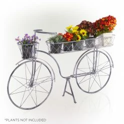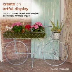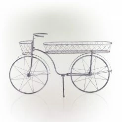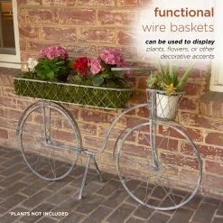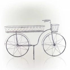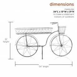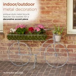 Add a vintage accent to your indoor or outdoor space with the Alpine Corporation Antique Metal Bicycle Decoration. This antique-style metal bicycle features two baskets for a decorative accent piece. The wire baskets can be used to display plants, flowers, or other decorative accents. This vintage bike can be placed on its own or paired with multiple decorations to create an artful display. Made from durable metal, this lawn decoration is weather-resistant and rust-resistant for years of quality use. This antique metal bike measures 54″L x 13″W x 31″H to make a statement in your home or yard, and it includes a one year manufacturer’s warranty from date of purchase.Alpine Corporation is one of America’s leading designers, importers, and distributors of superior quality home and garden decor products. Alpine’s award winning in-house design team continuously develops new and innovative “statements pieces” for your home and garden. Your outdoor living spaces will be the envy of the neighborhood with our wide assortment of fresh, fashionable and contemporary products, from beautifully crafted solar garden stakes featuring patented motion and fiber optic lighting technology to beautiful fountains and delightful bird baths and feeders.