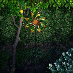 - Green and orange color scheme with plastic gems creates a stunning blend of moving colors as the floral-shaped blades spin in the wind