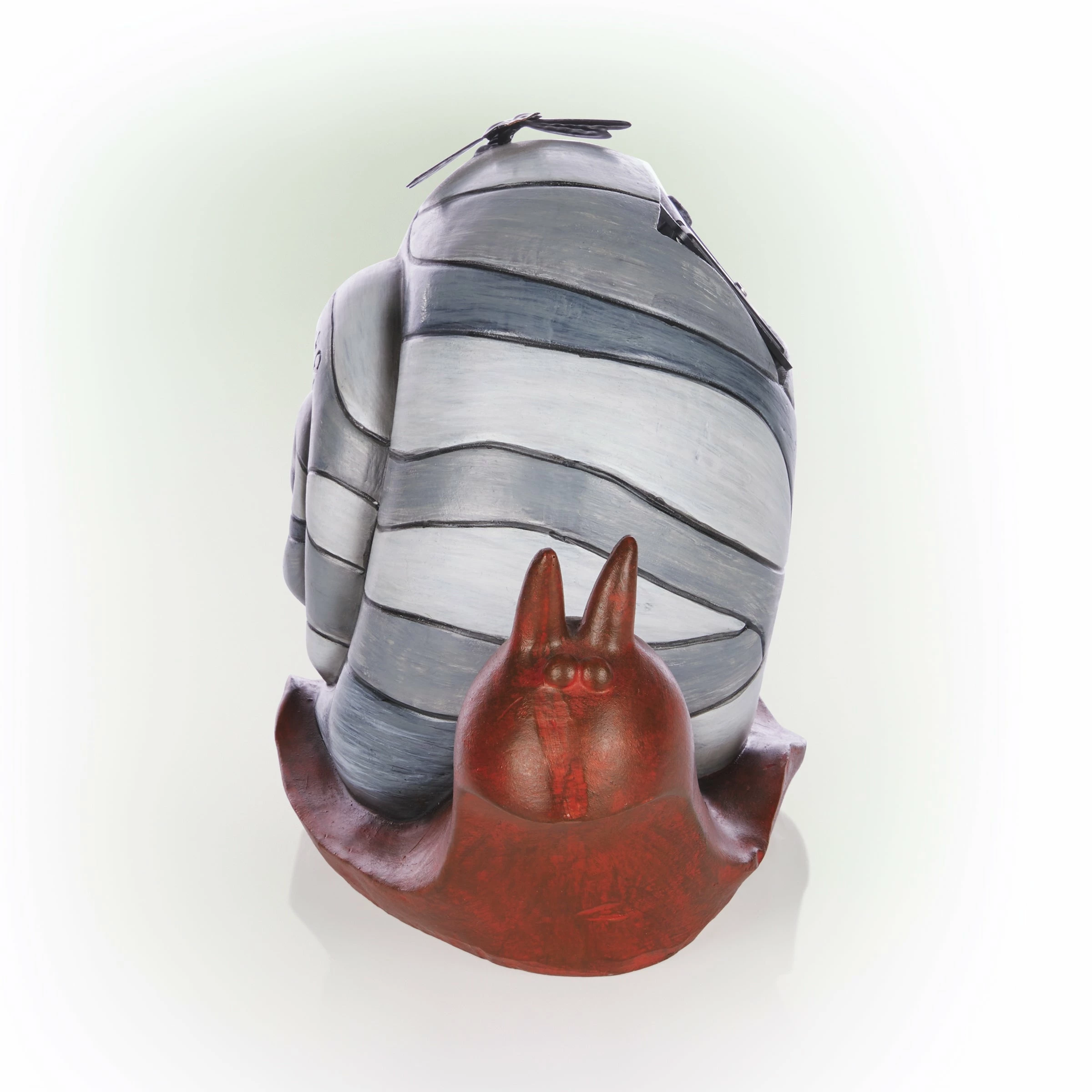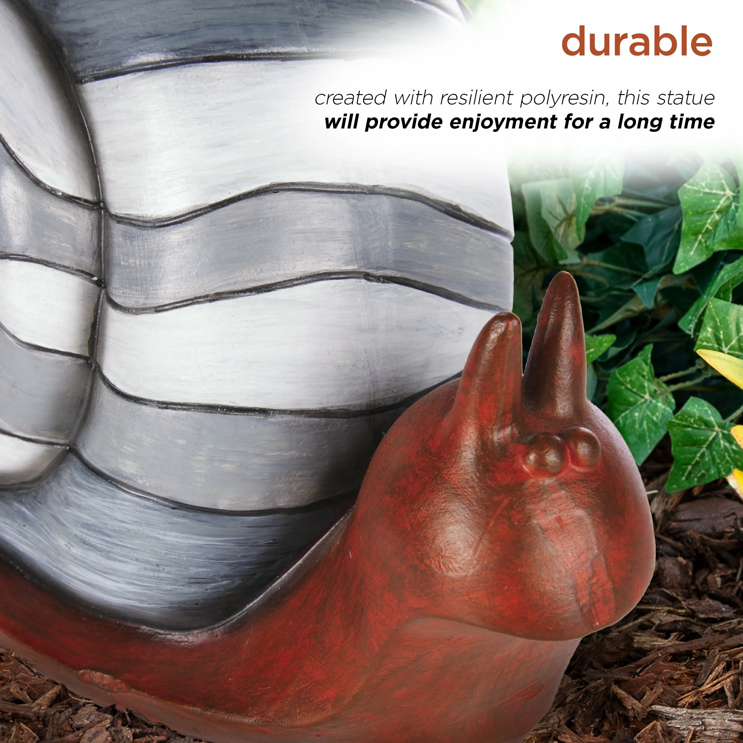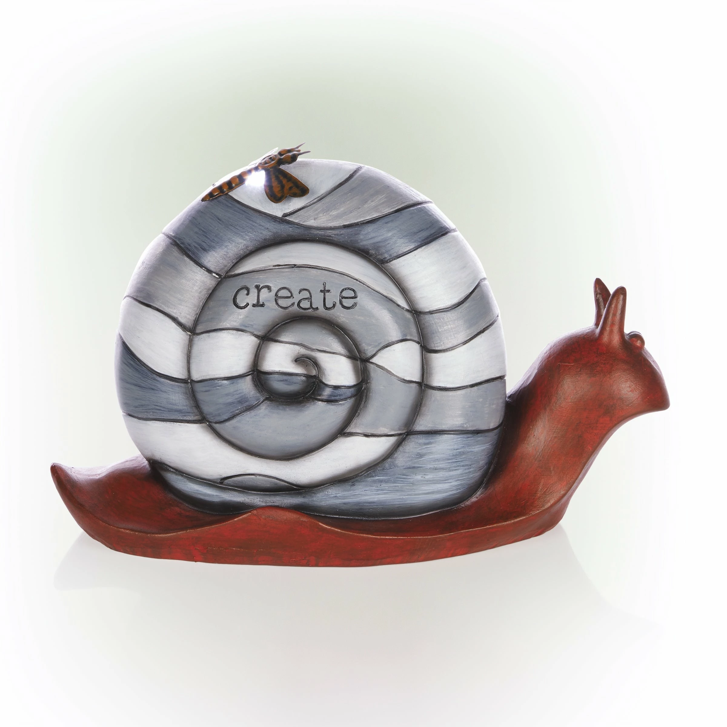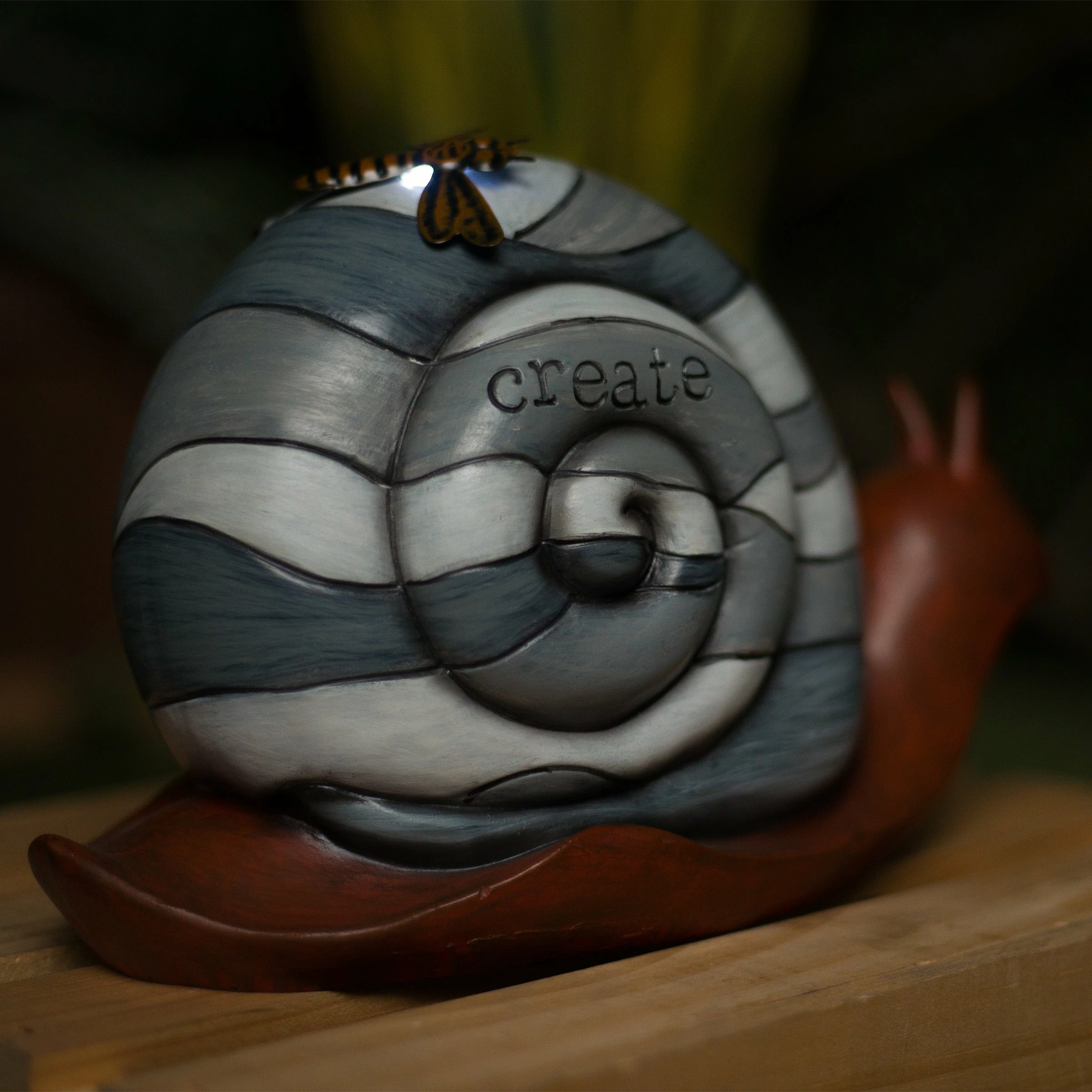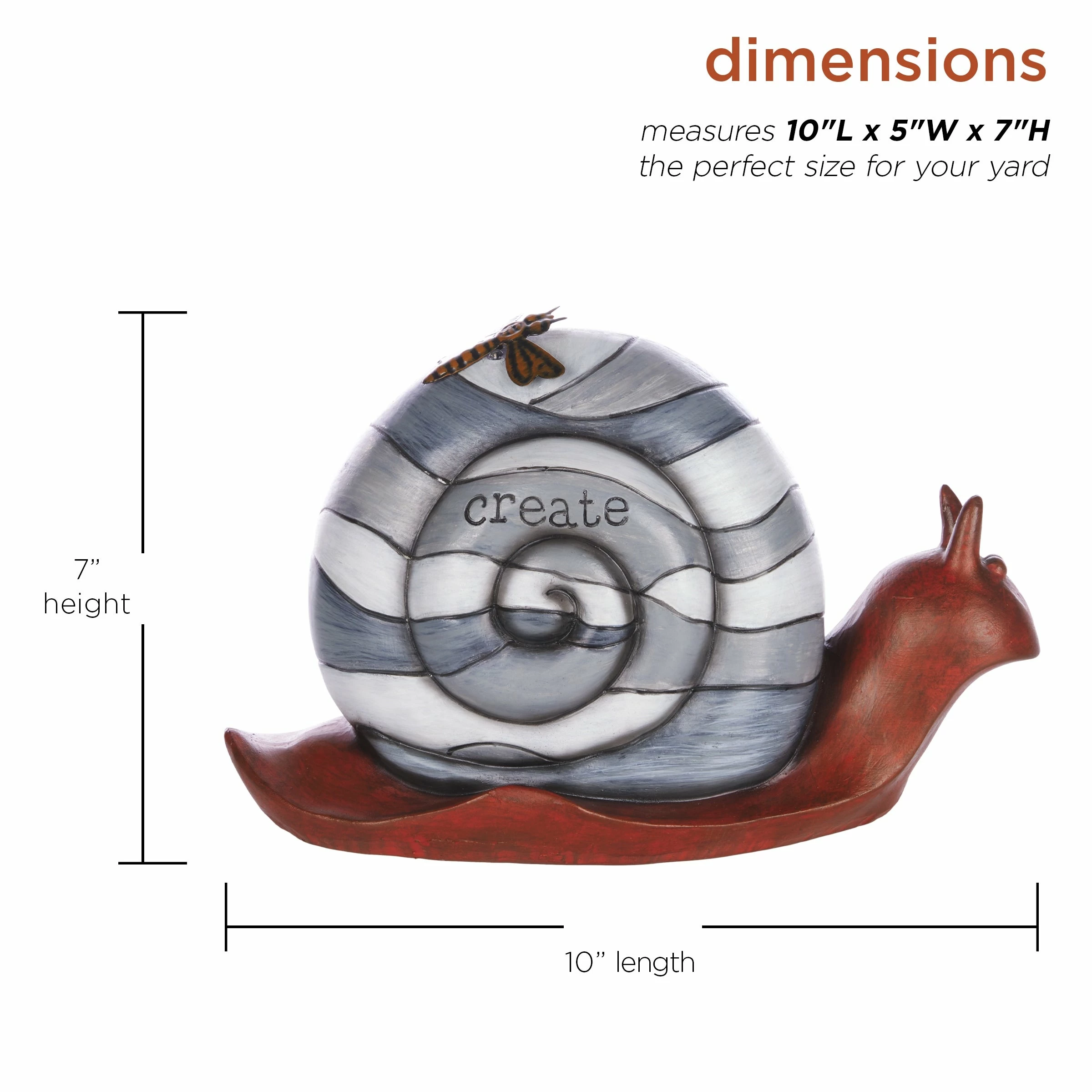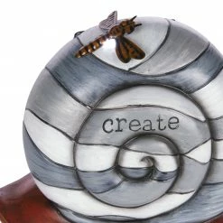 - Small snail statue with gray-toned striped shell with a copper-colored dragonfly accent and engraved with the word “create” to add an inspiring and adorable accent to your garden