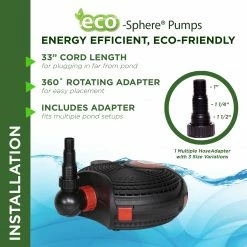 - Pump can be used vertically or horizontally for convenient placement in your pond, and has a 33′ long cord for easy placement and accessibility