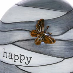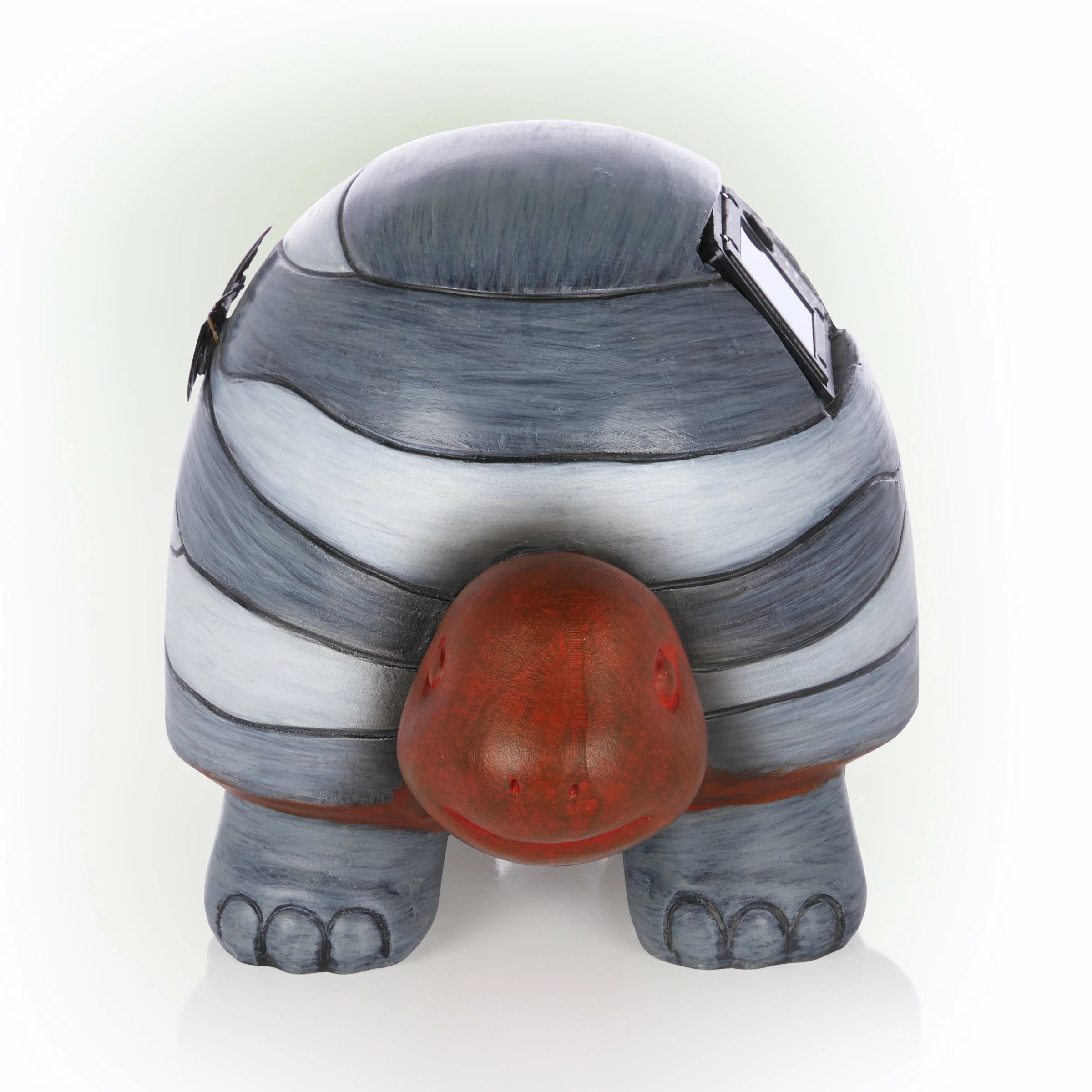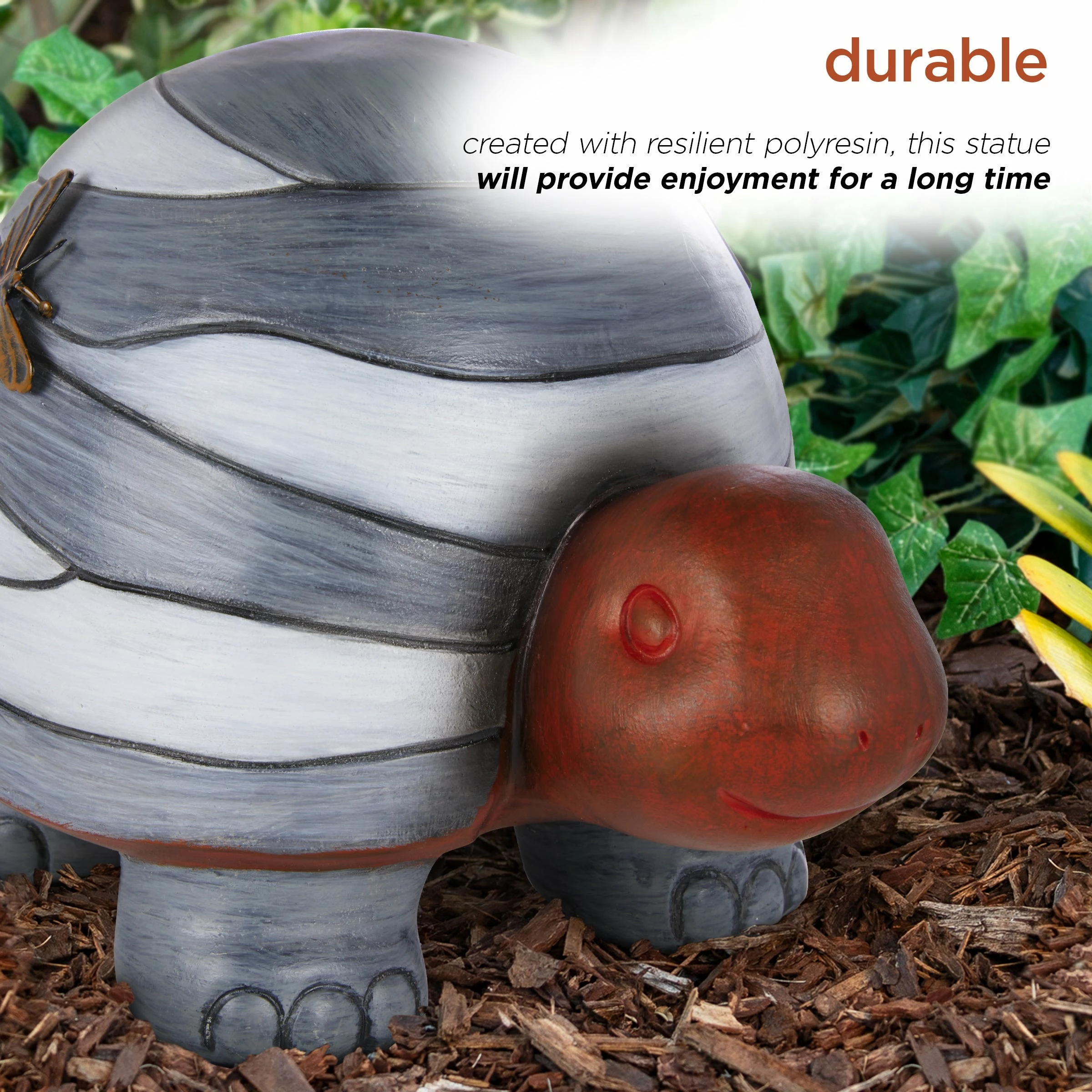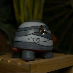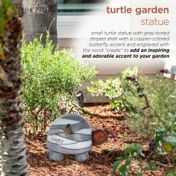- Small turtle statue with gray-toned striped shell with a copper-colored butterfly accent and engraved with the word “create” to add an inspiring and adorable accent to your garden