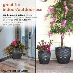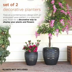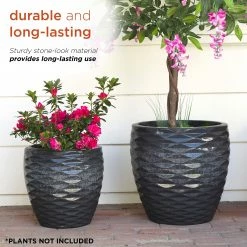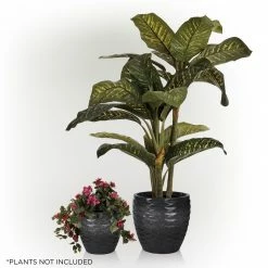 Enhance the natural beauty of your plants with the Alpine Corporation Etched Wave Vase Planters. This set of two coordinating planters feature a contemporary vase design with an embossed wave pattern in a finish for a decorative way to display your plants and flowers. The integrated bottom holes allow you to plant directly into the planters while allowing for proper drainage after watering. These versatile planters can be placed indoors in your entryway, living room, family room, or foyer as well as outdoors on your patio, porch, or in your garden. Use separately in different locations or together to create a coordinated garden display. The durable polystone material is weather-resistant and rust-resistant for long-lasting use. The large planter measures 17″L x 17″W x 16″H and the small planter measures 13″L x 13″W x 13″H to fit in almost any indoor or outdoor area, and they also include a one year manufacturer’s warranty from date of purchase.Alpine Corporation is one of America’s leading designers, importers, and distributors of superior quality home and garden decor products. Alpine’s award winning in-house design team continuously develops new and innovative “statements pieces” for your home and garden. Your outdoor living spaces will be the envy of the neighborhood with our wide assortment of fresh, fashionable and contemporary products, from beautifully crafted solar garden stakes featuring patented motion and fiber optic lighting technology to beautiful fountains and delightful bird baths and feeders.
