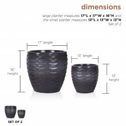 - Large planter measures 17″L x 17″W x 16″H and the small planter measures 13″L x 13″W x 13″H, and they include a one year manufacturer’s warranty from date of purchase