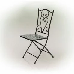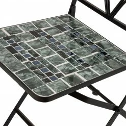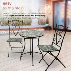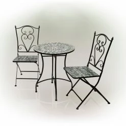 Enjoy friendly conversation and a cappuccino with the Indoor/Outdoor 3-Piece Bistro Set from Alpine Corporation. This decorative marbled glass mosaic table and chairs set will add a unique and elegant addition to your garden, courtyard, or indoor living area. The 3-piece set includes a table and 2 folding chairs and is perfect for smaller outdoor spaces, like apartment balconies or studio apartment eating areas. Skillfully crafted from tough, long-lasting and weather-resistant iron and finished with a chic and sophisticated glass mosaic tabletop and seats. The patio set is durable, and provides reliable, sturdy, and stable seating for 2 people. All 3 pieces are lightweight and the chairs are foldable, making them easy to pick up and transport to your preferred outdoor area for al fresco dining or enjoying your morning coffee indoors in your breakfast nook. They’re also compact and easy to store when you’re not using them. This table and chairs set is easy to maintain and clean. Simply wipe down with water and a mild soap or detergent to keep it looking brand new. The folding bistro table measures 24″L x 24″W x 28″H and chairs measure 17″L x 21″W x 38″H, and includes a one year manufacturer’s warranty from date of purchase.Alpine Corporation is one of America’s leading designers, importers, and distributors of superior quality home and garden decor products. Alpine’s award winning in-house design team continuously develops new and innovative “statements pieces” for your home and garden. Your outdoor living spaces will be the envy of the neighborhood with our wide assortment of fresh, fashionable and contemporary products, from beautifully crafted solar garden stakes featuring patented motion and fiber optic lighting technology to gorgeous glass and glow-in-the-dark bird baths and feeders.