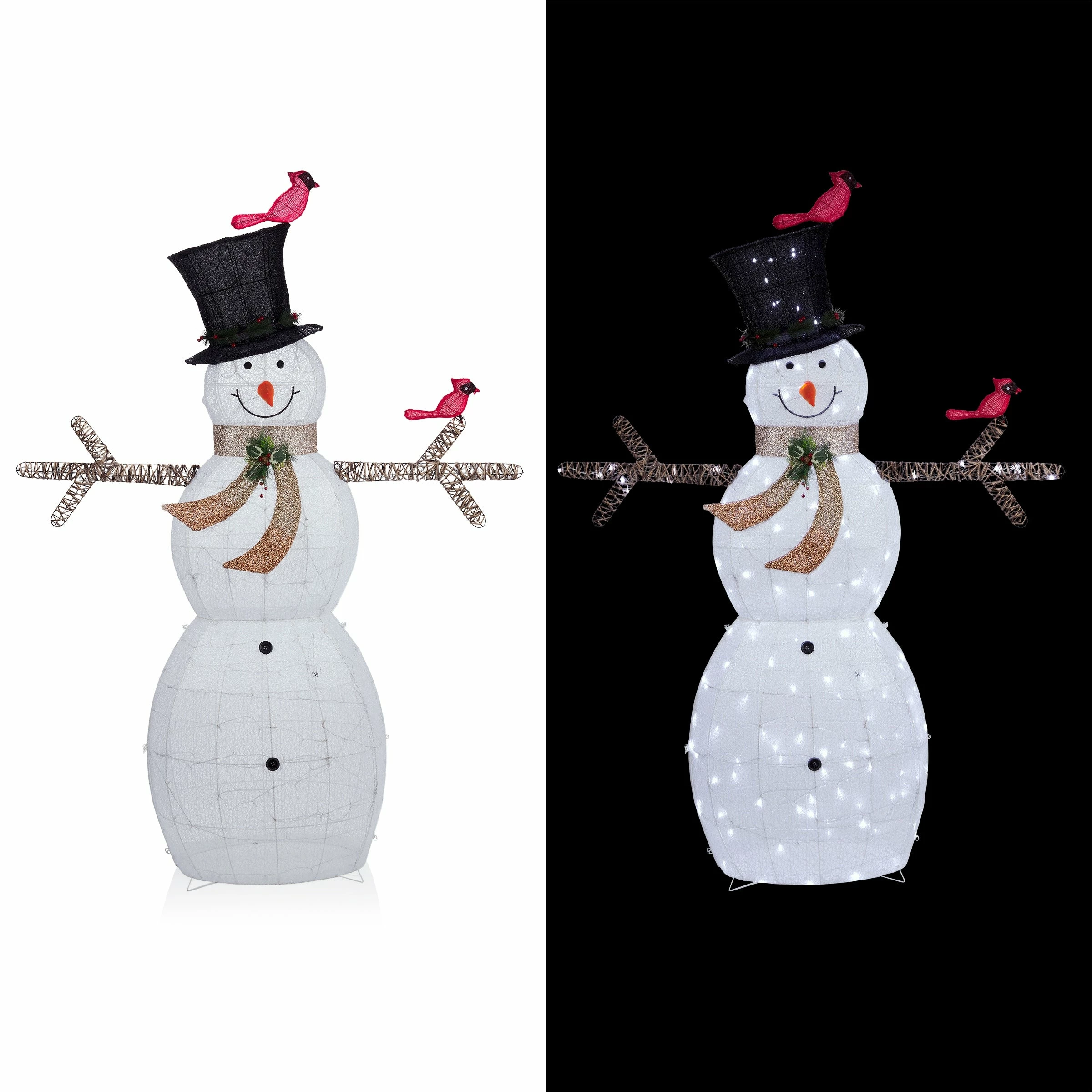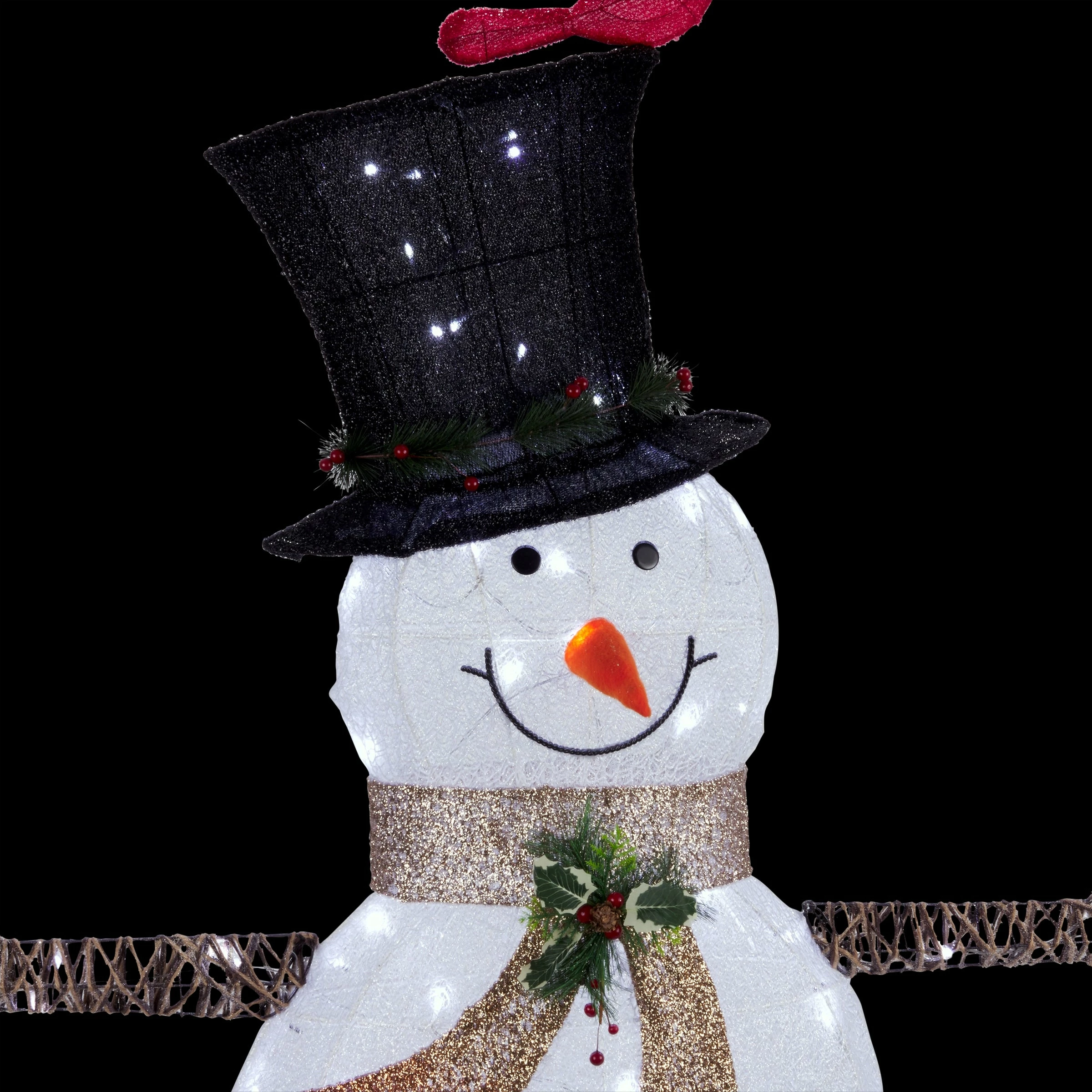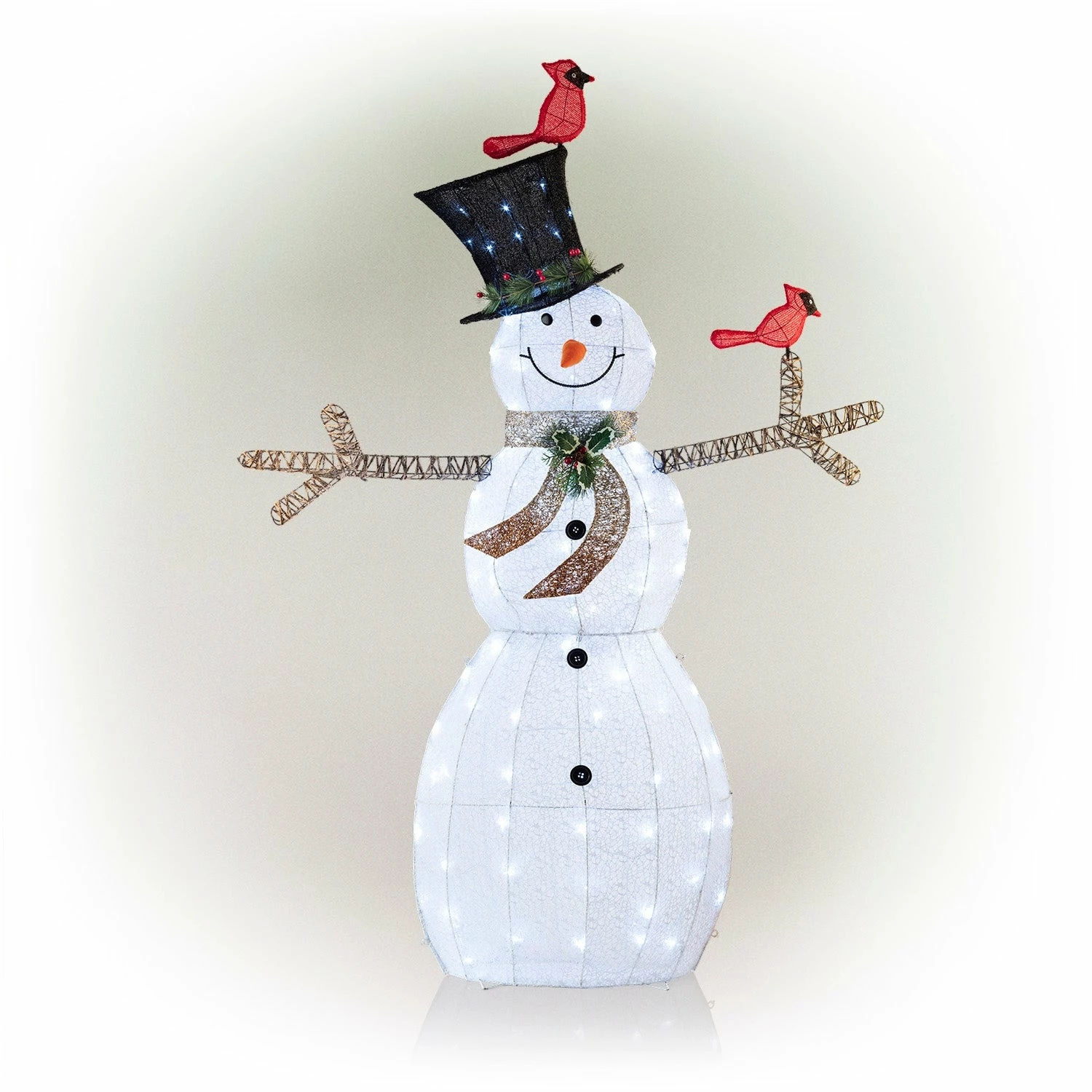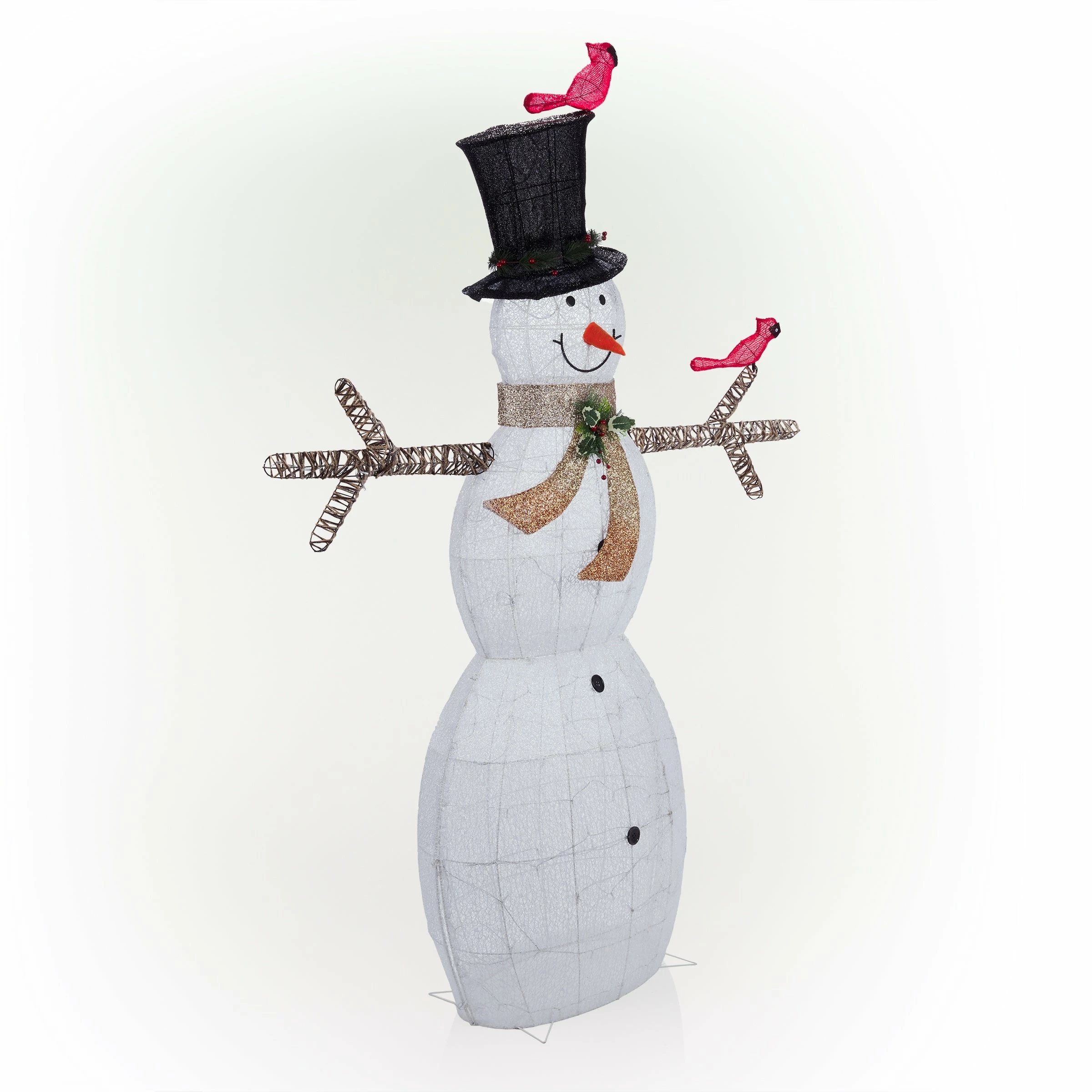 - White mesh snowman statue with decorative birds is perfect for spreading holiday cheer in your yard
