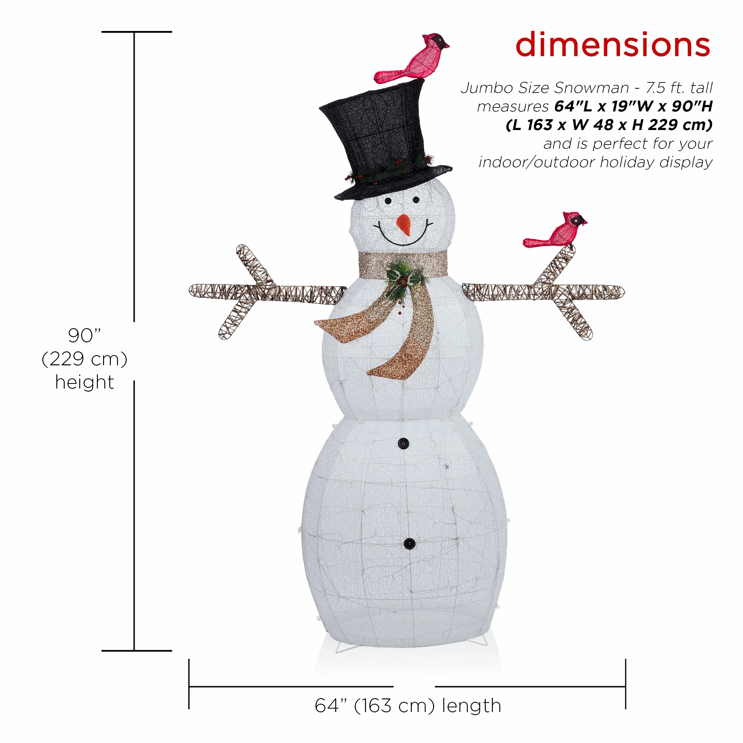 - Snowman decoration measures 50″L x 14″W x 74″H, the perfect size for a versatile holiday display. A one-year manufacturer’s warranty from date of purchase is also included.