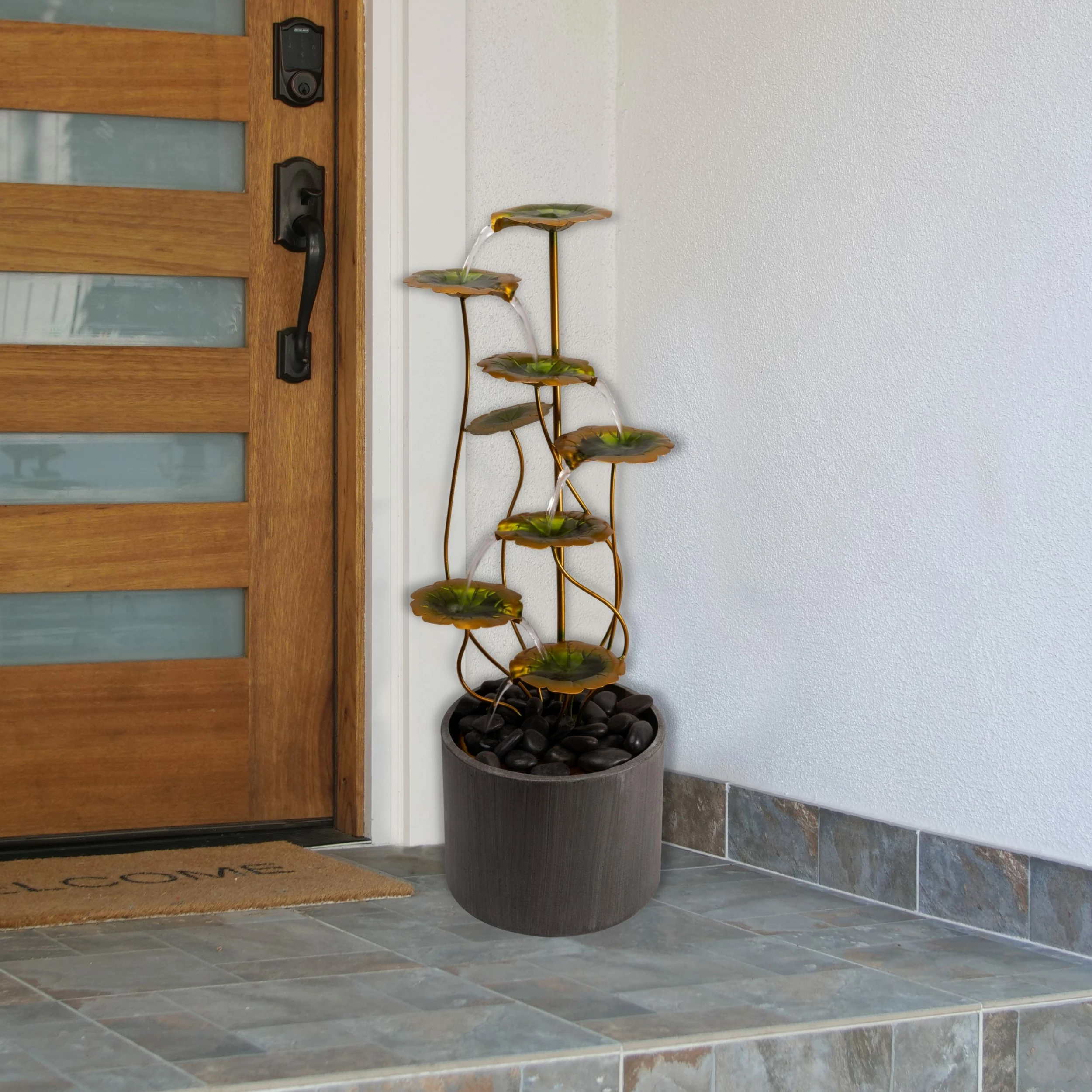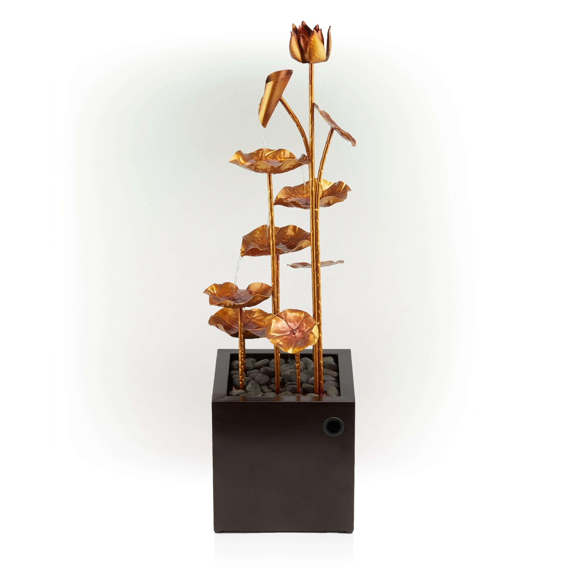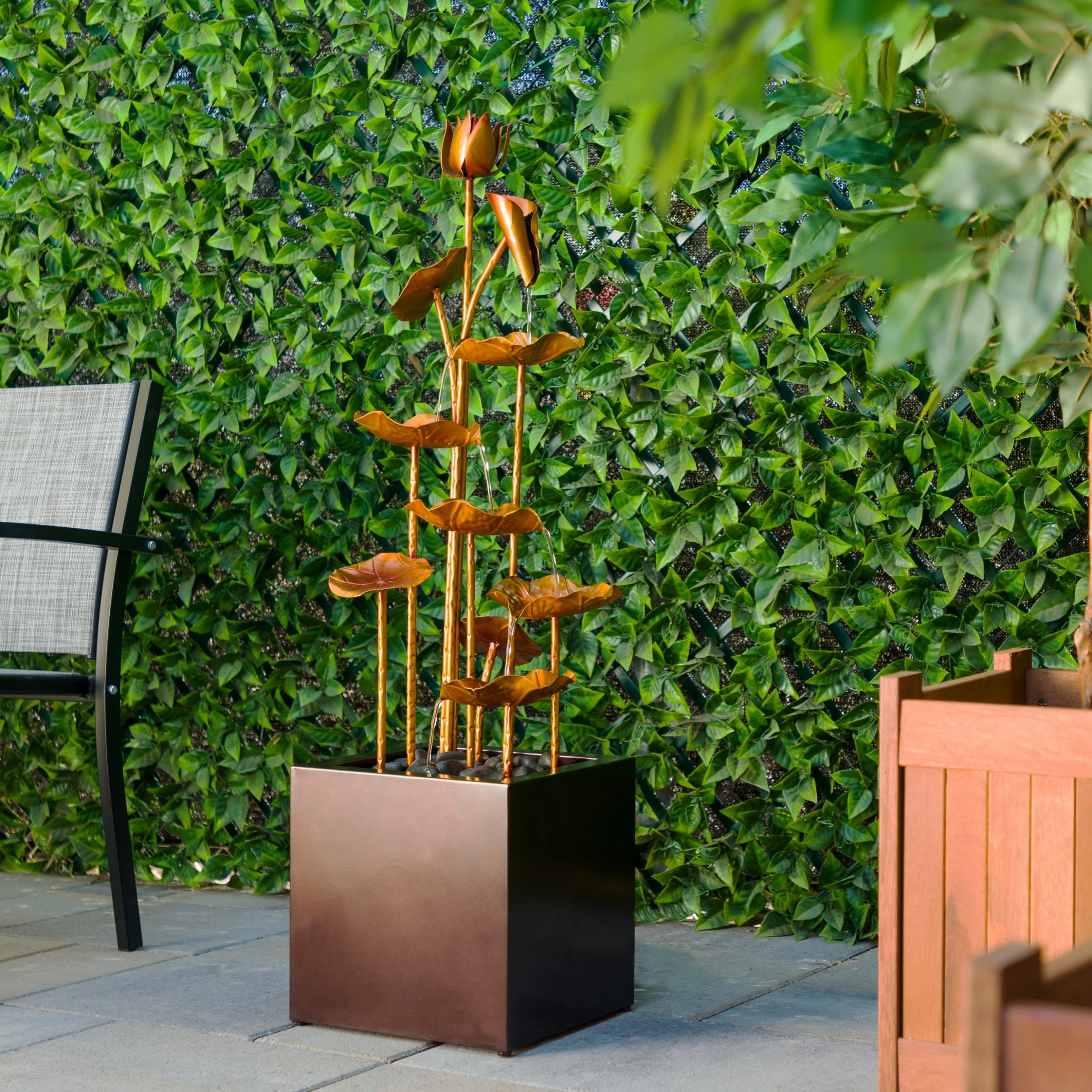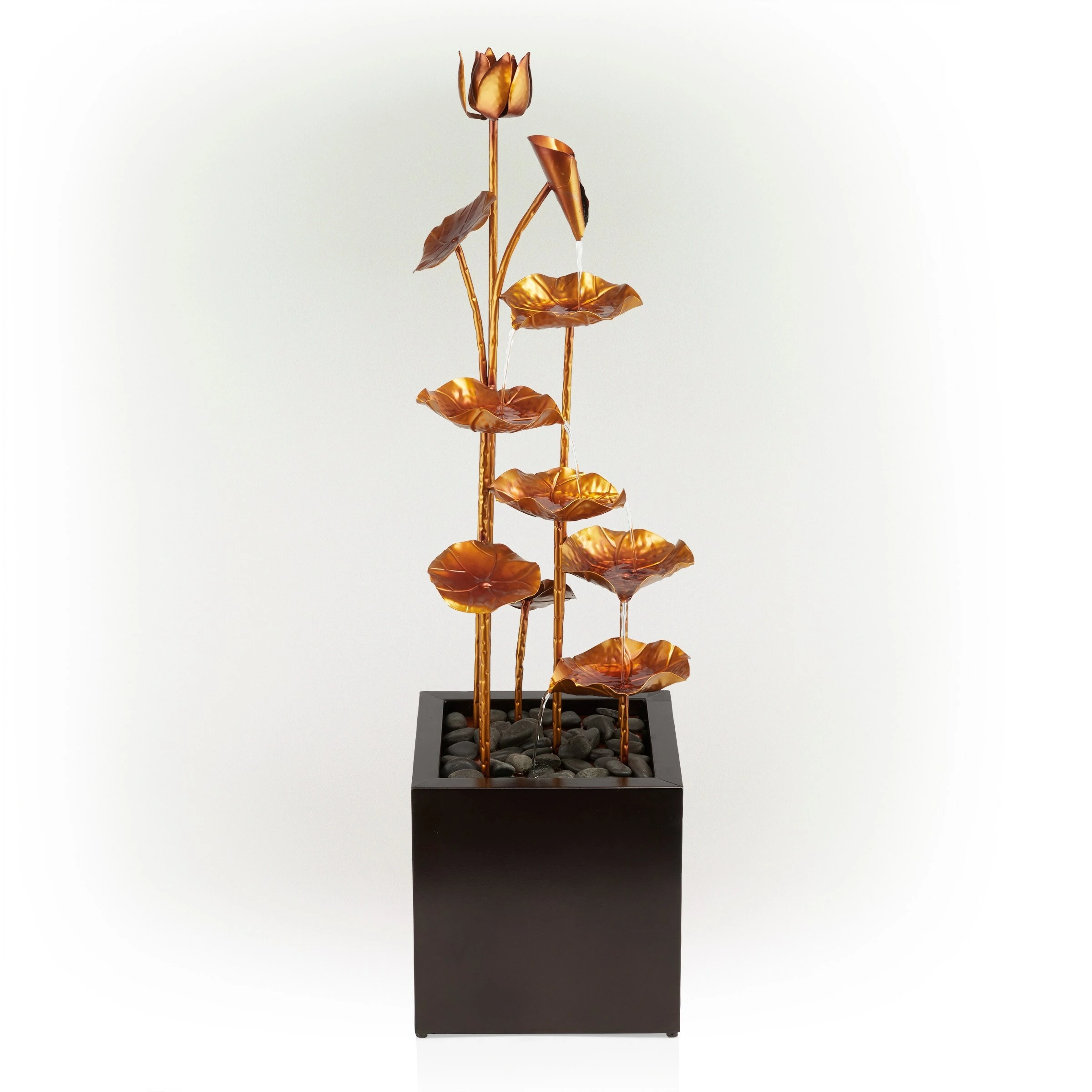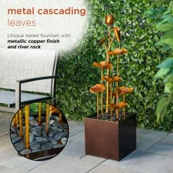 Add nature-inspired style to your outdoor space with the Alpine Corporation Outdoor Metal Fountain. With this high-quality fountain, you can create a meditative, relaxing atmosphere, even in an urban jungle. The copper-colored leaves that elegantly cascade water down to the river rocks in the modern base will create a focal point in your garden, patio, deck, porch, or yard space. Take in the tranquil sounds of the water gently flowing to create a calming environment. The galvanized metal construction is weather and rust-resistant, and durable for years of quality use. To use, simply plug the 6 ft. cord in to an outdoor outlet, fill lower level with water, and watch as the interior pump creates a lovely water flow reminiscent of a trickling stream. With a 1-year warranty, you can be confident in the quality of your purchase. The fountain is for use in any outdoor area.