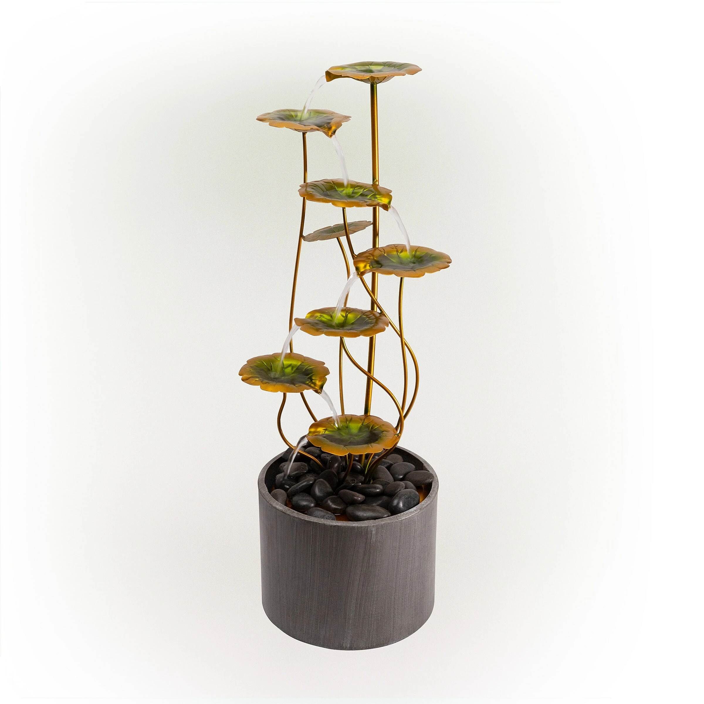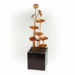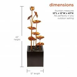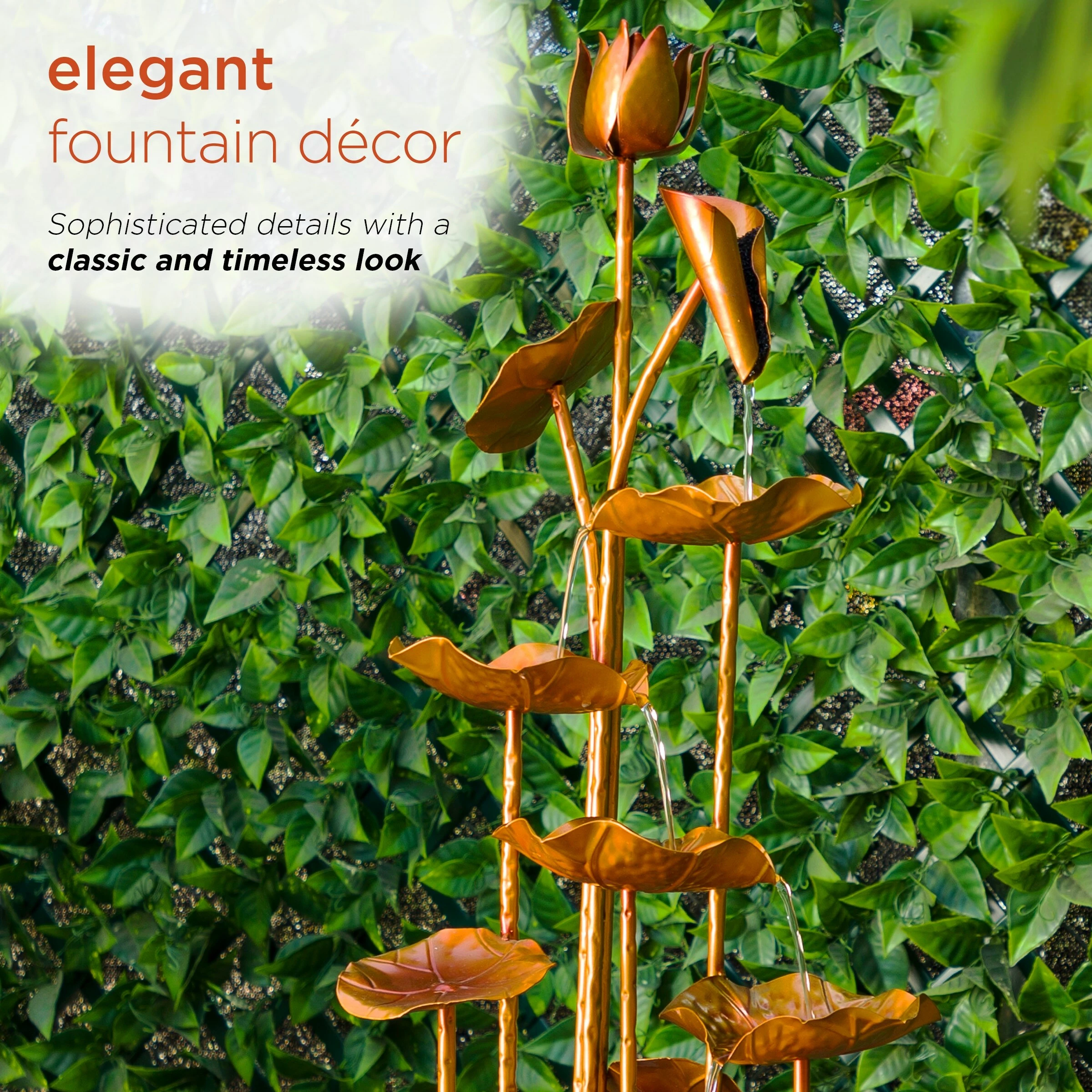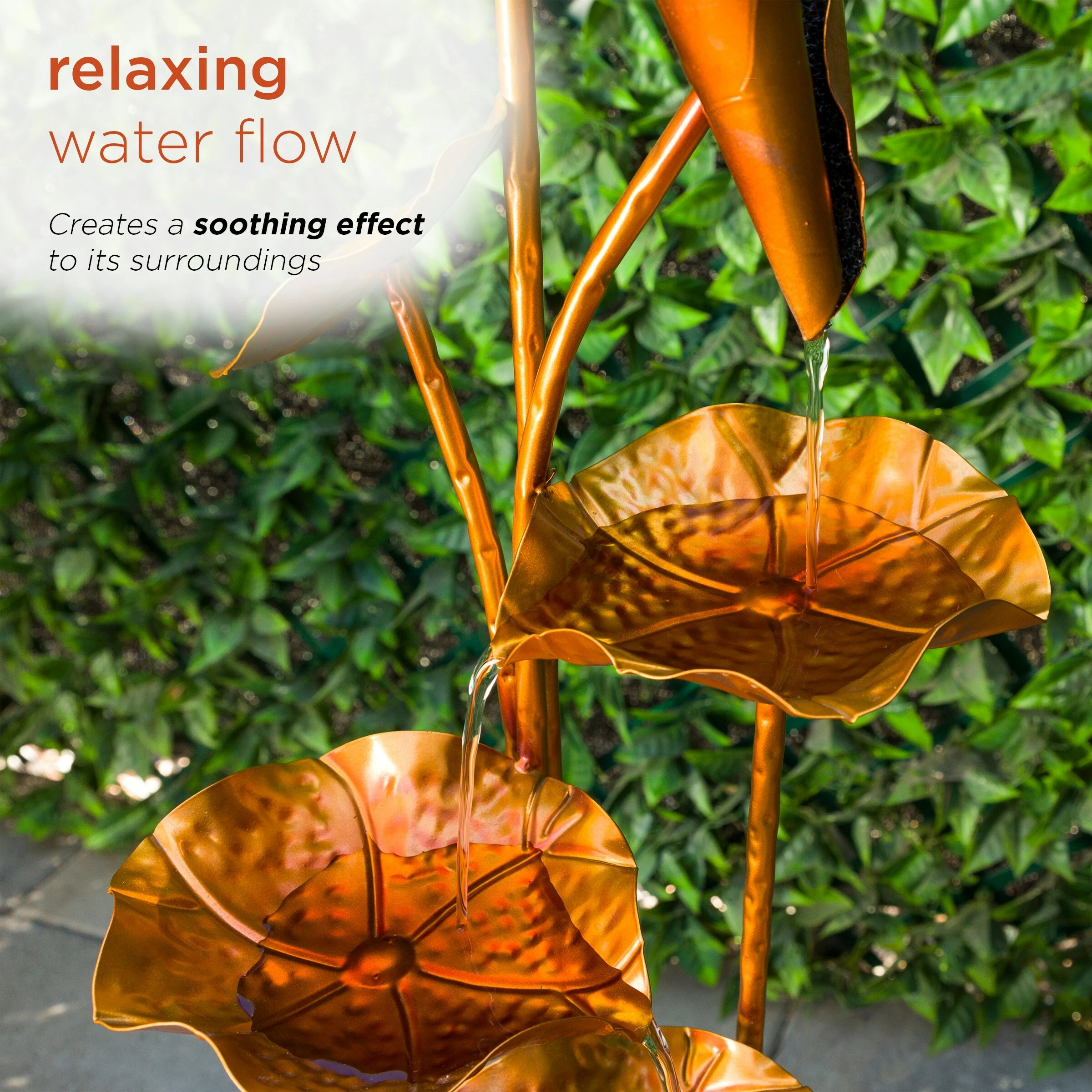 Add nature-inspired style to your outdoor space with the Alpine Corporation Outdoor Metal Fountain. With this high-quality fountain, you can create a meditative, relaxing atmosphere, even in an urban jungle. The copper-colored leaves that elegantly cascade water down to the river rocks in the modern base will create a focal point in your garden, patio, deck, porch, or yard space. Take in the tranquil sounds of the water gently flowing to create a calming environment. The galvanized metal construction is weather and rust-resistant, and durable for years of quality use. To use, simply plug the 6 ft. cord in to an outdoor outlet, fill lower level with water, and watch as the interior pump creates a lovely water flow reminiscent of a trickling stream. With a 1-year warranty, you can be confident in the quality of your purchase. The fountain is for use in any outdoor area.