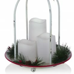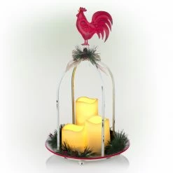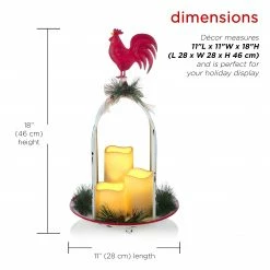 - A farmhouse-inspired faux candle decor, featuring winter greenery and a red rooster mounting the top