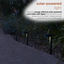 - Features energy efficient solar-powered cool white LED lights that function up to 8 hours on full solar charge and are controlled by an on/off switch
