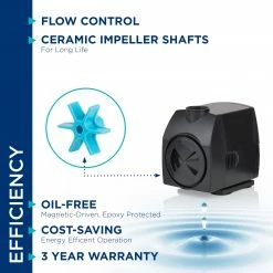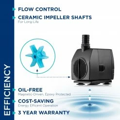 - Oil-free design with ceramic impeller shafts provides a reliable, long-lasting fountain water pump that resists damage and keeps water flowing, and has a GPH of 900